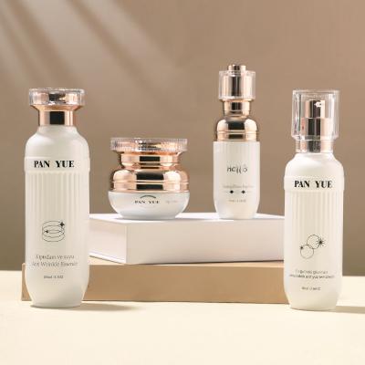 This luxurious skin care product glass packaging, white, champagne, transparent color can be selected, vertical stripe bottle body and acrylic champagne lid more elegant luxury.