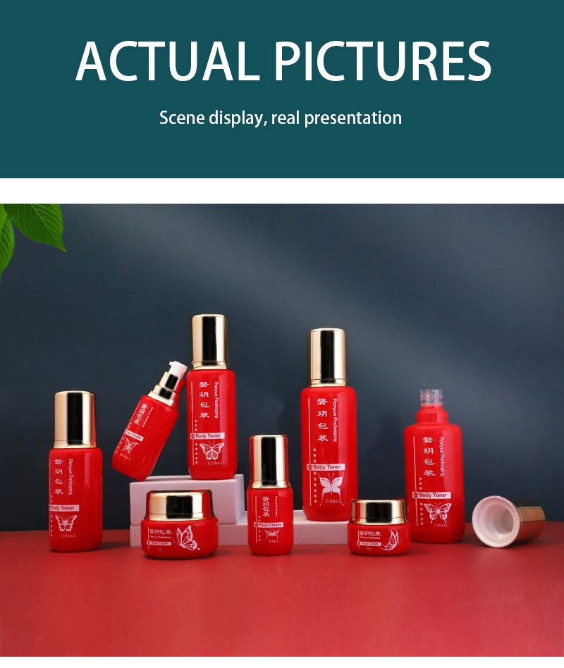 The cosmetic bottle set using environmentally friendly glass raw materals,the bottle body is transparent and quality is guaranteed.We can provide custom service as your requirement.